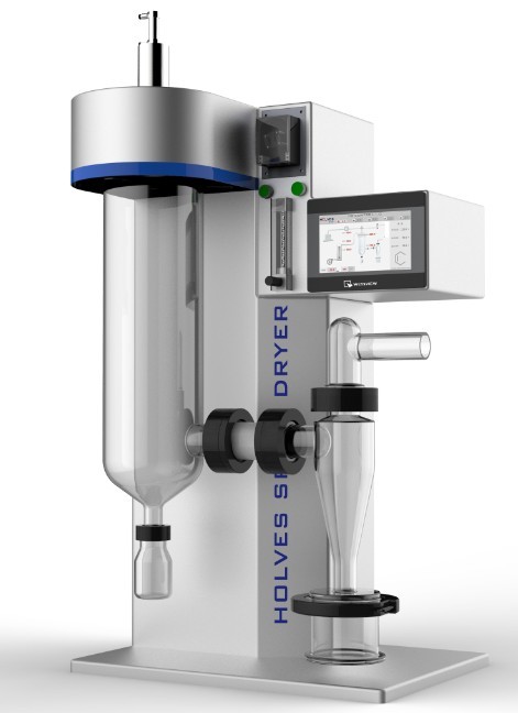 小型噴霧干燥機(jī)通過(guò)機(jī)械作用,將需干燥的物料,分散成很細(xì)的像霧一樣的微粒,(增大水分蒸發(fā)面積,加速干燥過(guò)程)與熱空氣接觸,再瞬間將大部分水分除去,使物料中的固體物質(zhì)干燥成粉末。