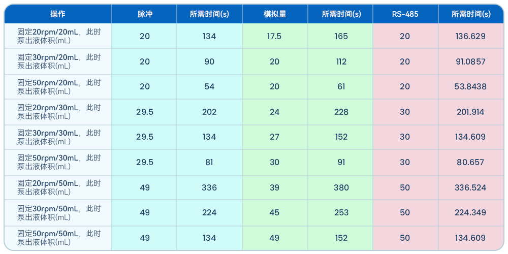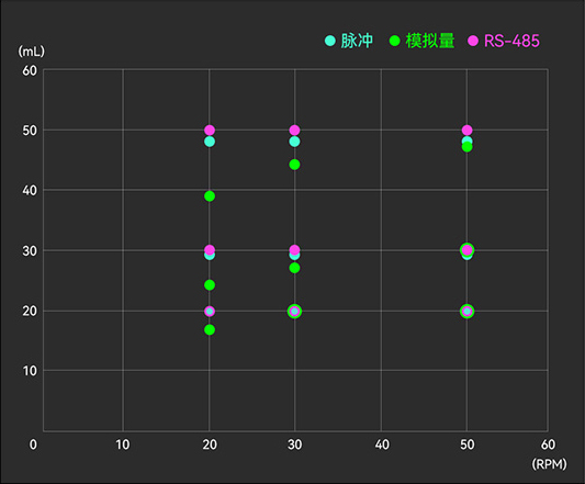 從表中數(shù)據(jù)可以看出,一旦改變了轉(zhuǎn)速和泵出量,不同的驅(qū)動方式控制的蠕動泵會有不同結(jié)果。3種驅(qū)動方式中,RS-485通訊方式的控制精度最優(yōu),脈沖次之,模擬量的誤差最大。